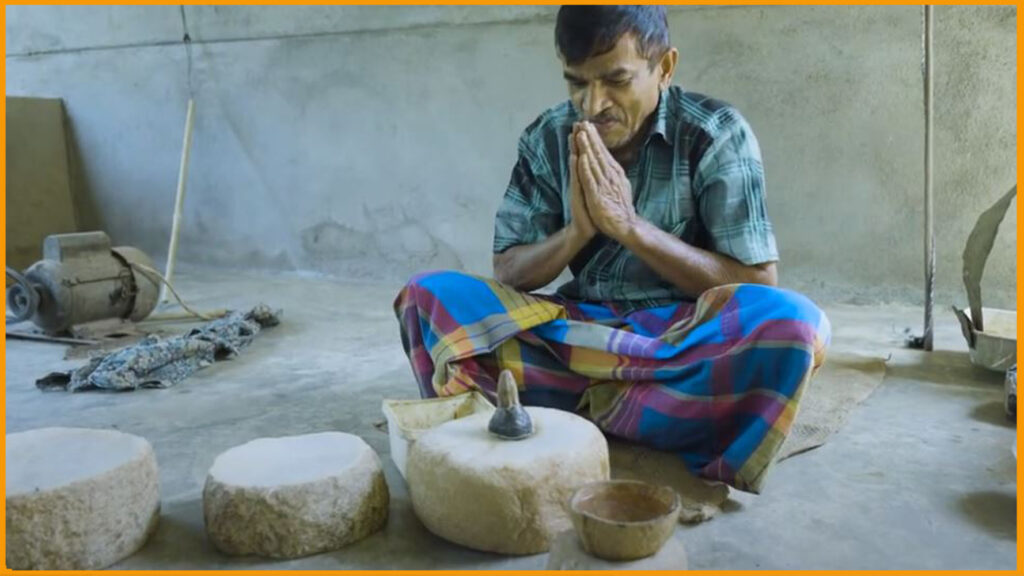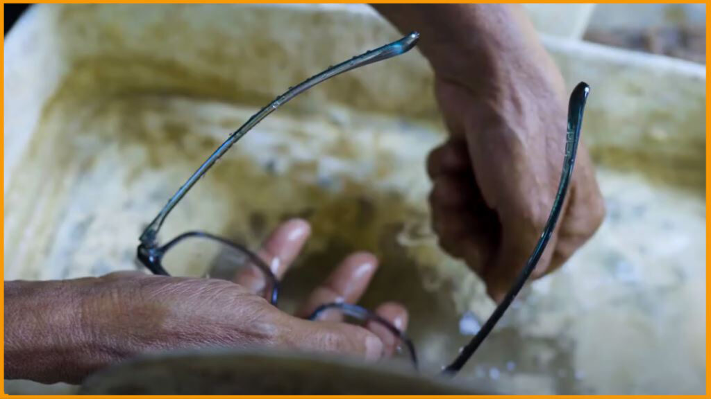 කණ්ණාඩි නිෂ්පාදනයේ යෙදෙන ශිල්පීන් විසින් එසේ පතල්වලින් ගෙන එන ගල්ල වර්ගකර පලා සකස් කර ගන්නා අතරල පලිඟු ගල් පලා කපා ගන්නා කොටස් බට්ටුගලේ අල්ලා මැණික් පතල්වලින් හමුවන කට්ටා ගල් කැට කුඩු කර පෙරා භාජනයේ අඩියේ මිදෙන මන්ඩි කොටස :කුරුදුමැට්ට* ඒ සදහා සකස් කරගත් තිරුවානා ගලේ දමා වීදුරුවක් මෙන් වනතුරු ඔපමට්ටම් කර ගනී.